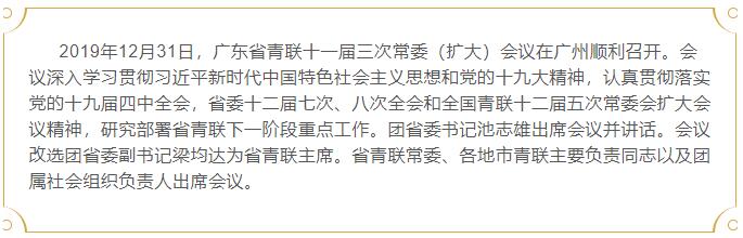 会上,梁均达同志代表省青联第十一届常务委员会作工作报告。省青联副主席赵淦森、吴杰庄,常委谢伟、吴碧珊等四位委员,围绕积极投身粤港澳大湾区建设、助力港澳青年融入国家发展大局等主题进行交流发言。会议审议通过了有关人事事项,表彰了2018-2019年度广东省青联优秀集体、优秀委员。会上同时发布了2020年“青年同心圆计划”粤港澳台青年交流合作发展项目。